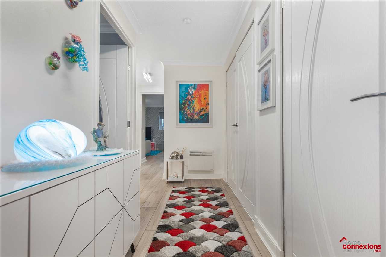 It has recently been renovated benefiting from a mix of modern and neutral decor throughout, with a system of electric heating as well as double glazed windows providing attractive views over the delightful, well tended gardens which surround the property. The property is perfectly positioned occupying a great position, benefiting from a modern fitted kitchen and upgraded shower room. The kitchen has been fitted to include a great range of wall and floor mounted units as well as a range of integrated appliances. Overlooking the surrounding gardens through a large feature bay window, the lounge offers a great space for relaxing and entertaining, tastefully complete with a feature decorative wall, coving and laminate flooring. The bedrooms are generously sized offering fitted storage cupboards along with further space for free standing furniture, both complete with laminate flooring. The shower room has been upgraded and re-fitted to include a three piece suite comprising of a walk in shower finished with non-slip vinyl flooring and wet wall panelling. Internally the property offers great hallway storage to include two large storage cupboards with plenty of shelved and hanging space.