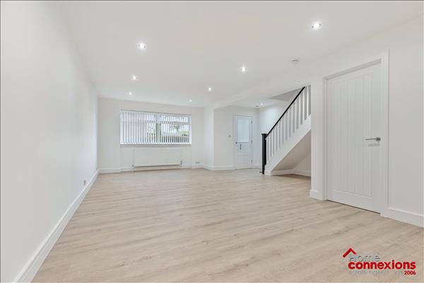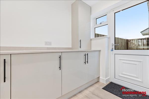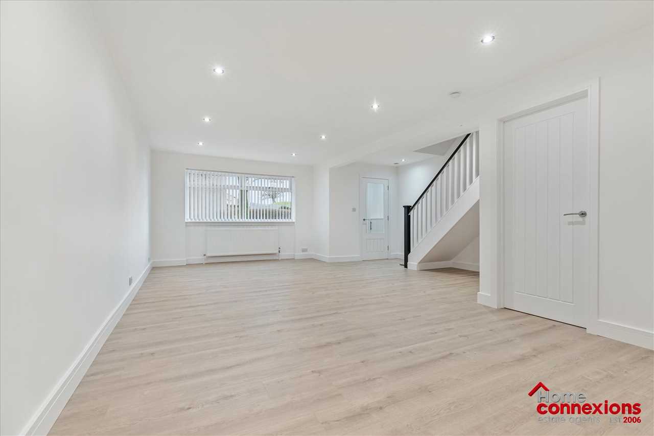 Internally, the accommodation is bright, spacious, and exceptionally presented, with a contemporary layout designed to suit modern lifestyles. To the front of the property there is a spacious open plan lounge dining room which is semi open plan to the kitchen off to the rear and overlooking the rear garden. The full space boasts beautiful quality flooring which flows seamlessly throughout the lower level to include the lower level w.c. and the utility room. The lounge and dining area are perfect for relaxing and entertaining perfect for modern day family living. Off the lounge there is also a large area which could be used as a home office, study or play room depending on the new owners needs. The home benefits from a newly fitted kitchen, finished with sleek units, quality worktops, and a selection of integrated appliances, creating a practical yet stylish space for everyday living and entertaining. There are two luxury and newly fitted bathrooms comprising of a lower level two piece w.c. and a large main bathroom on the upper level. Both have been perfectly fitted and complete with quality fixtures and finishings which include modern sanitaryware and tasteful wet wall panelling. The staircase and upper level landing benefits from newly fitted luxury carpet which continues into all three bedrooms, which offer space for free standing furniture, whilst bedrooms one and two benefit from fitted storage cupboards.