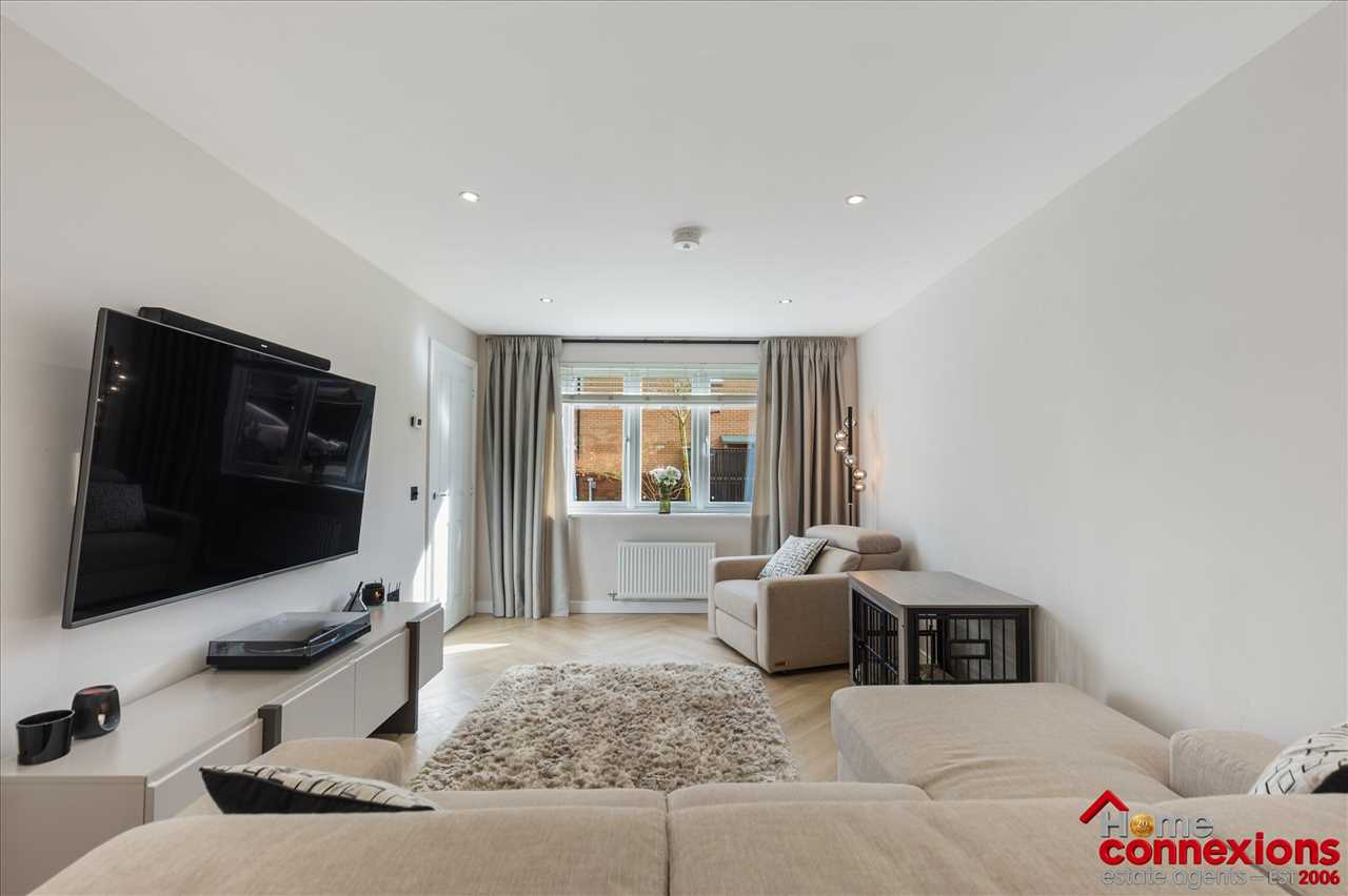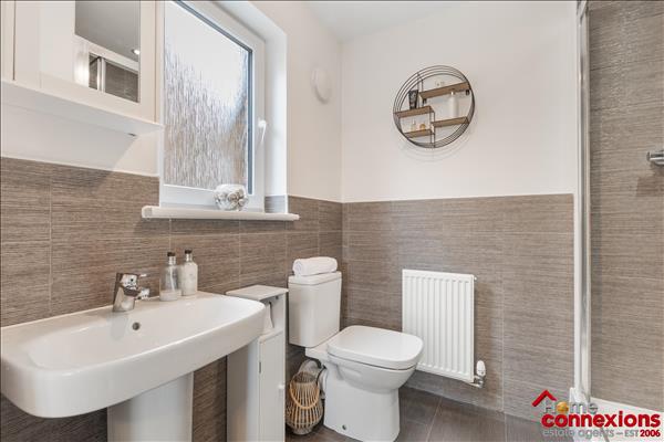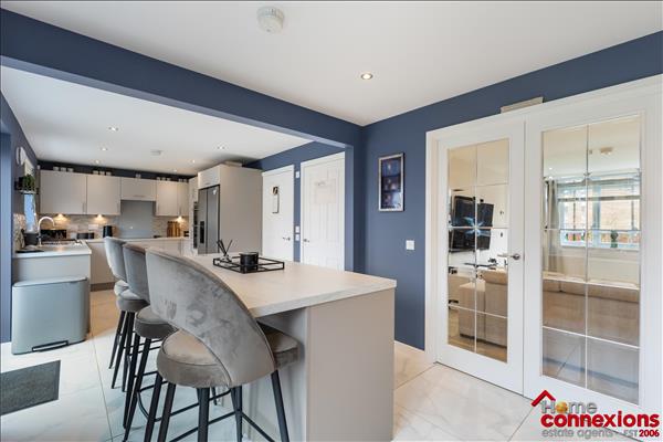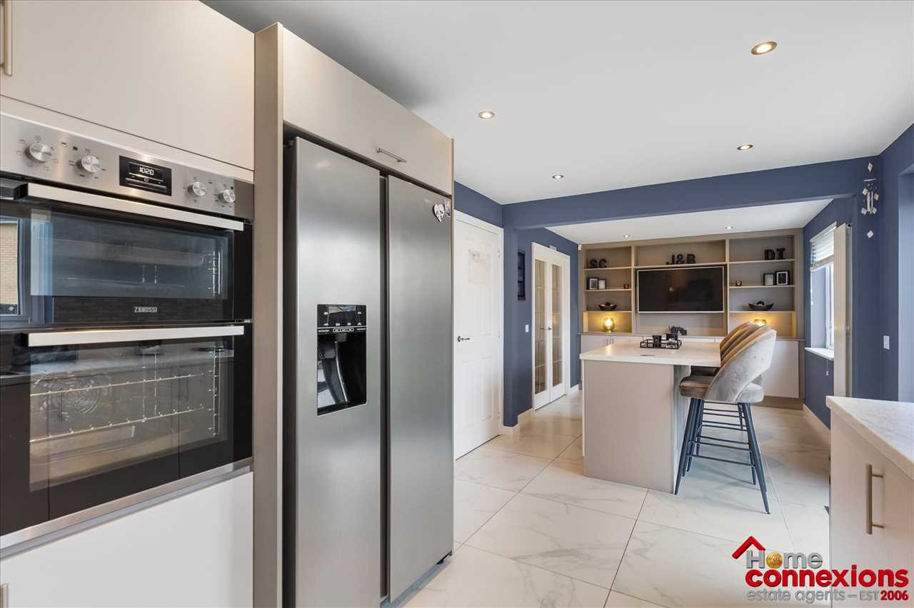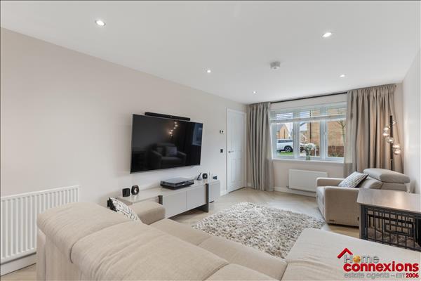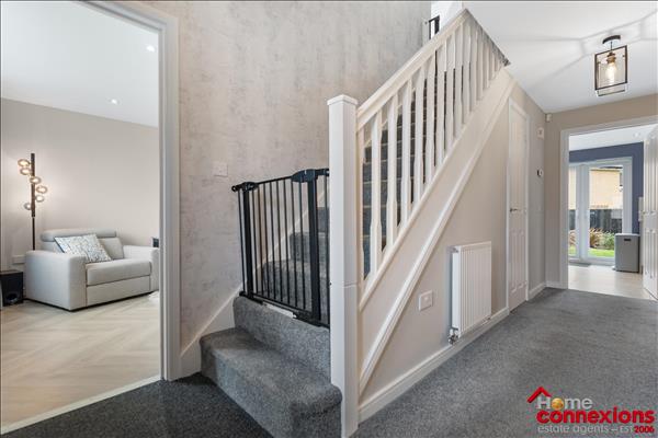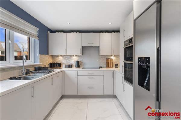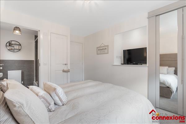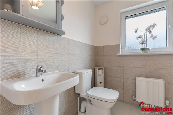The property comprises of four well proportioned double bedrooms, four modern bathrooms (including two en-suites, main bathroom & lower level w.c.) and a beautifully fitted open plan kitchen dining family room occupying the full rear area of the house. It has been fitted to include a great selection of wall and floor mounted units along with complimentary worktops and feature focal island. There is a selection of integrated appliances. space for additional free standing appliances, wall tiling and complete with space for eating and relaxing. The kitchen continues to impress with a light and airy open plan family area boasting a feature media wall and complete with patio doors leading out to the rear garden. The lower level is complete with two large storage cupboards as well as access to the first to four bathrooms.