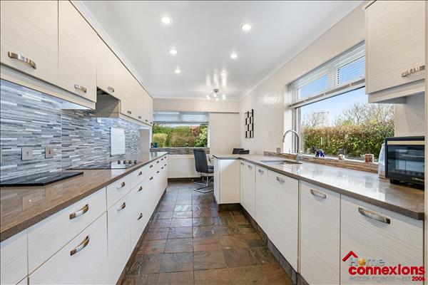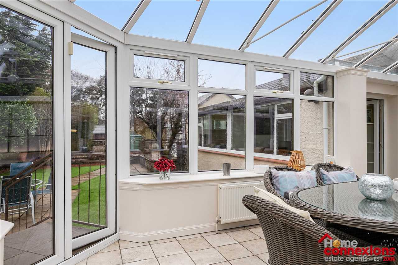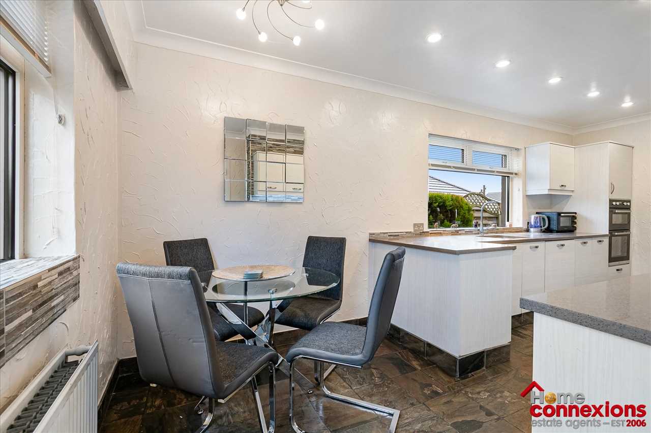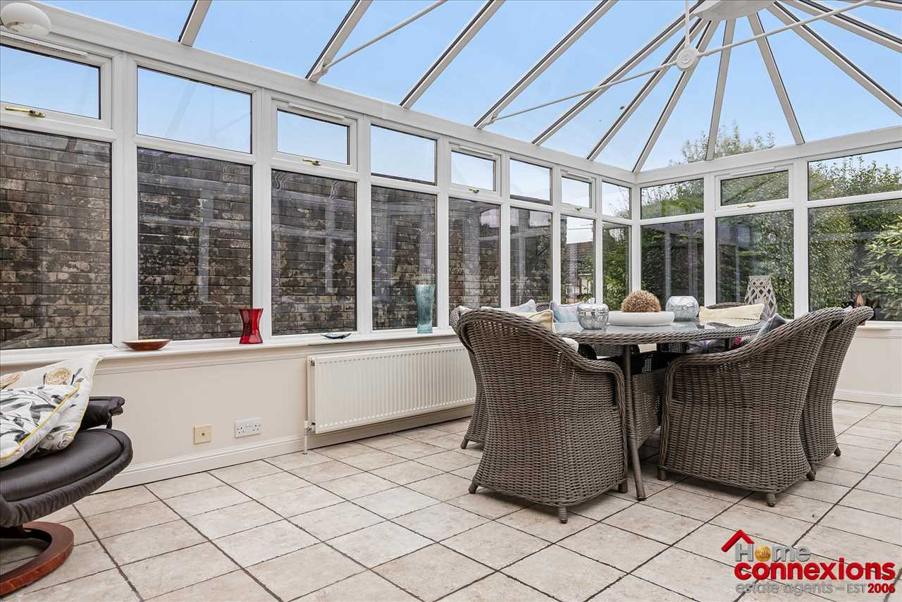 The property boasts a very well designed layout benefiting from a large covered porch area creating a fabulous front entrance coming off a large gated driveway and landscaped front garden. Internally it comprises of a welcoming reception hallway offering access throughout featuring a bright and welcoming main lounge dining room, complemented by a second reception room ideal as a family room or home office. The lounge and dining room offers a great space for relaxing and entertaining along with benefiting from space for a dining suite ideal for formal and informal eating. The room is complete with fitted carpet and coving with the lounge area also offering a feature media wall. The conservatory boasts unspoiled views across the rear garden, tastefully complete with tile flooring. The room can be used for a number of purposes whether this be an additional family room, home office space or even as a childrens play room. There is a beautifully appointed kitchen provides excellent range of wall and floor mounted units along with complimentary workspace. It also offers a selection of integrated appliances, space for additional free standing appliances, complete with wall and floor tiling. The kitchen area also offers a good size breakfasting nook.